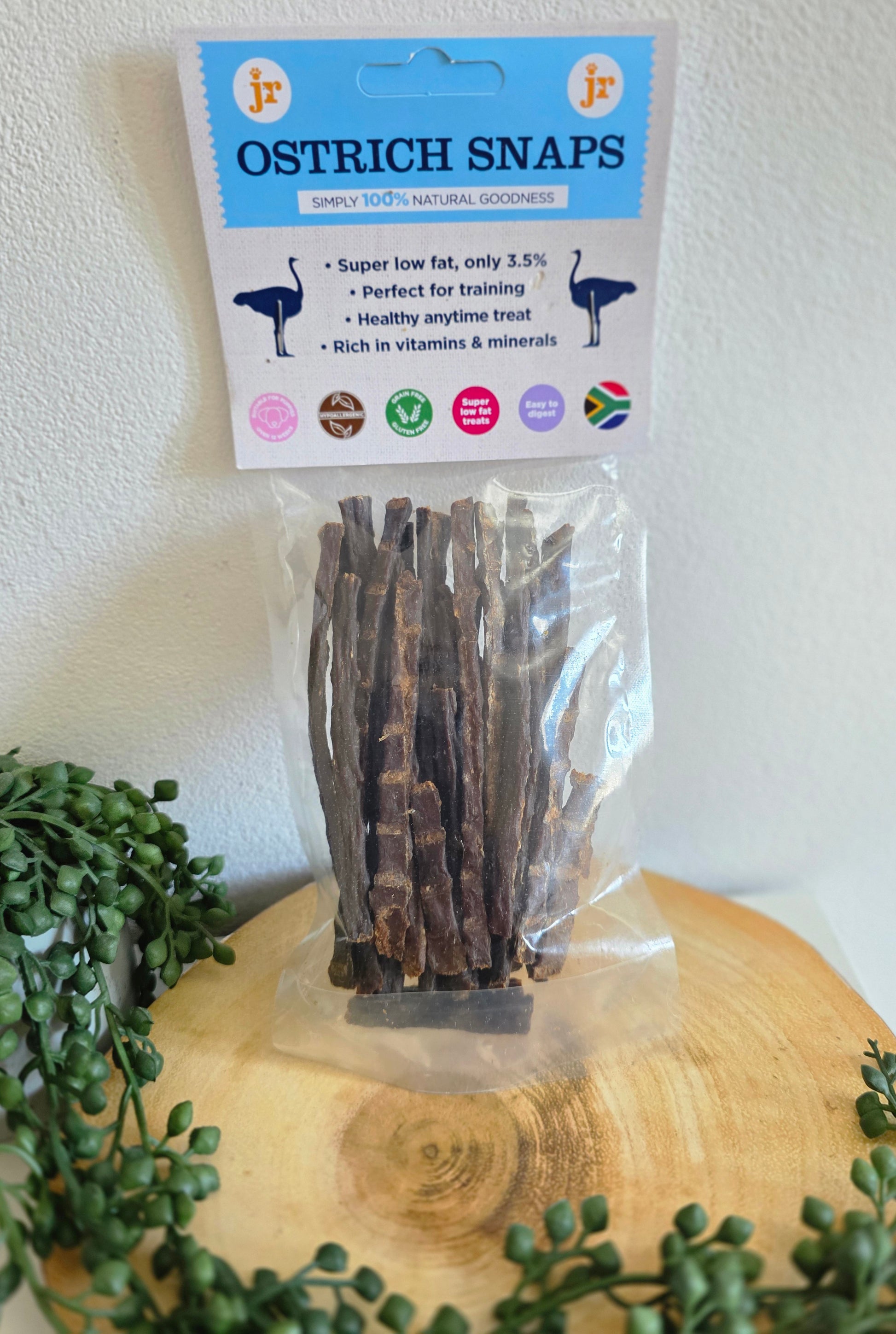 JR’s Ostrich Snaps are the perfect natural treat for dogs of all ages and sizes. Made from Ostrich steak, these tasty, air-dried sticks are super palatable and incredibly low in fat, at just 3.5%, making them an ideal reward for dogs on a low-fat diet or those simply watching their waistlines.